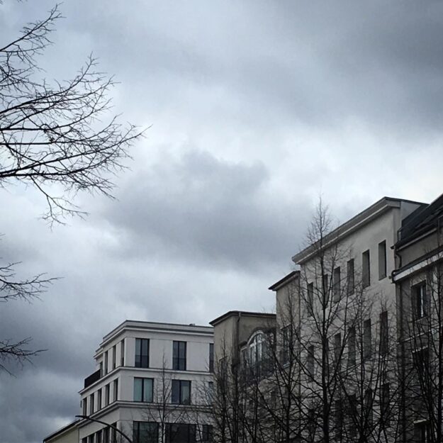Another one of those photo in grey-in-grey: grey clouds and grey houses in Berunnenstrasse, Mitte.