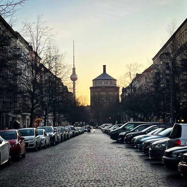 Rykestrasse in Prenzlauer Berg on a cold but beautiful Sunday afternoon at the end of January. View of the water tower, with the TV-Tower in the background.