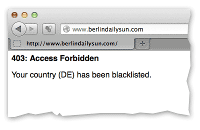 Well – so I tried to read the full article, over at Berlindailysun. But clicking that link only lead me to a page that said “Your country (DE) has been blacklisted.”. Huh. No offense – but whoever designed that error message could probably have added some piece of additional information. Or? Well. Anyways – It must be quite a bit frustrating when you’re running a local newspaper in a small town newspaper in New Hampshire, population around 10.000, and then there are all these people that would like to read english/american news about Germany’s capital Berlin. So in that sense I do understand to block a website for a hole country – but the error message could indeed be a bit more ‘welcoming’ :)