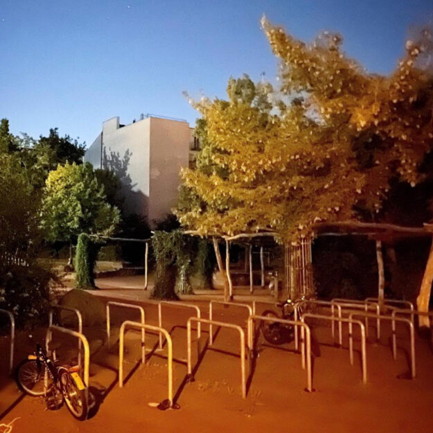 View of the Berlin TV Tower from the intersection of Veteranenstraße and Fehrbelliner Straße. In the foreground you can see parts of the overhead line of streetcar line 12. On the left side the top of an old East Berlin street lamp can be seen. Behind that you can see trees that border the upper […]