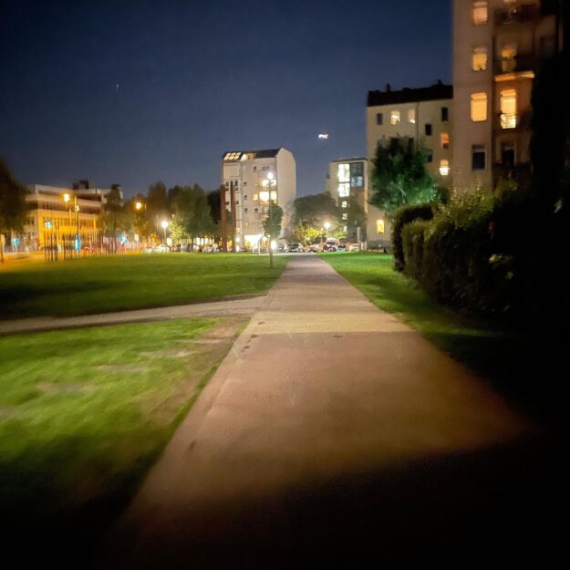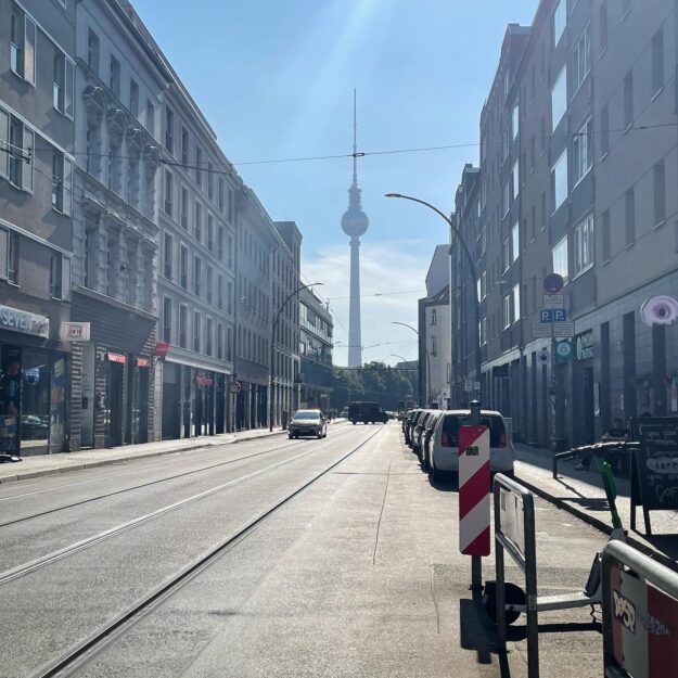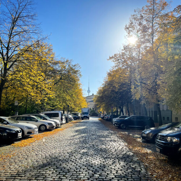 View down Eberswalder Strasse towards the Schönhauser Allee crossing on a rather warm-ish December evening. A tram of the metro line M10 is heading west, the tail lights of the evening traffic glow in the semi-darkness. One of the floodlight-towers of the stadium in Friedrich-Ludwig-Jahn-Sportpark can be seen in the background.