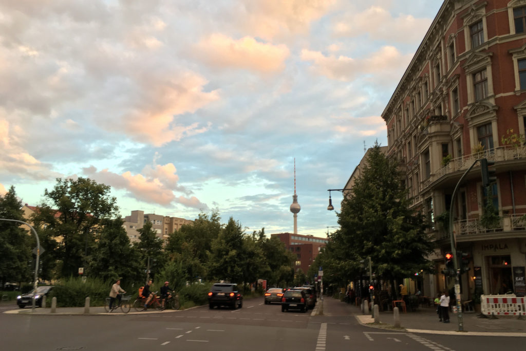 View from Schönhauser Allee near Senefelder Platz towards Mitte – the Berlin TV Tower is seen in the distance, fading to grey.