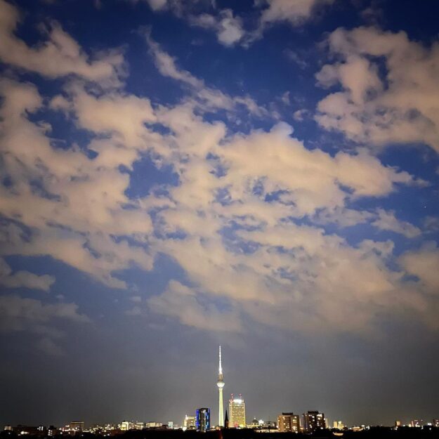 Berlin’s Skyline as seen from a roof top in Prenzlauer Berg on a warm and cozy summer night.