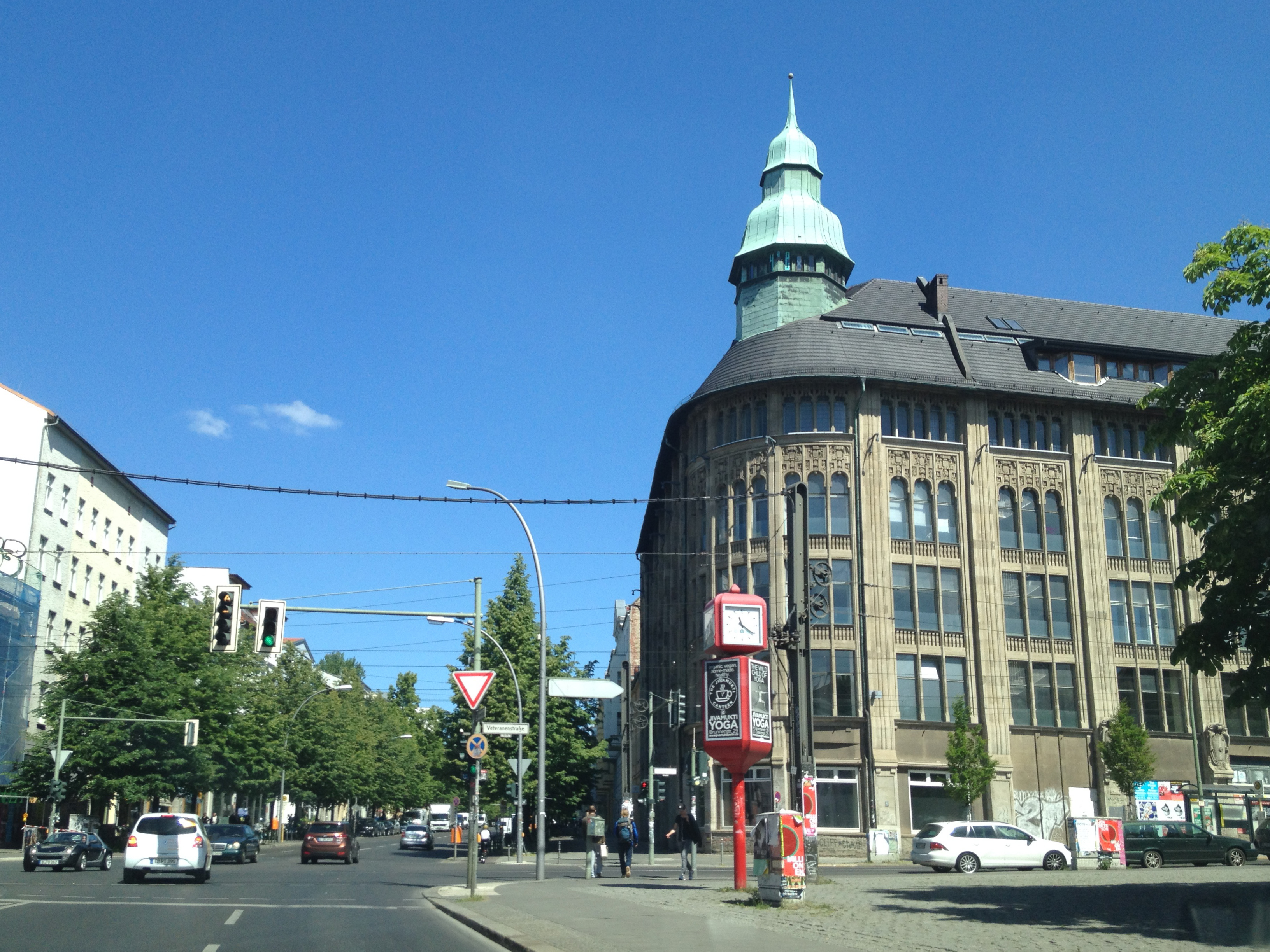 At the crossing of Brunnenstrasse with Veteranenstrasse and Invalidenstrasse a majestic old building, the former department store Jandorf (Brunnenstrasse 19–21), is waiting for even better times. On the opposite side of the crossing a not so majestic and old police station, which may look like a firefighter station since it is almost completely painted in red.