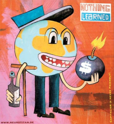 “The Friendly Capitalism Lounge is back at Galerie neurotian after a year’s break in Wedding! Under the title “nothing learned”, we take an astonished look at the world and its incredible talent for burying its head in the sand at the moment of the greatest crises. The worst president of all time is back and the nuclear threat is also back. The climate report is a disaster, crises and wars are everywhere, but as long as there is money to be made, everything will continue as before….. “