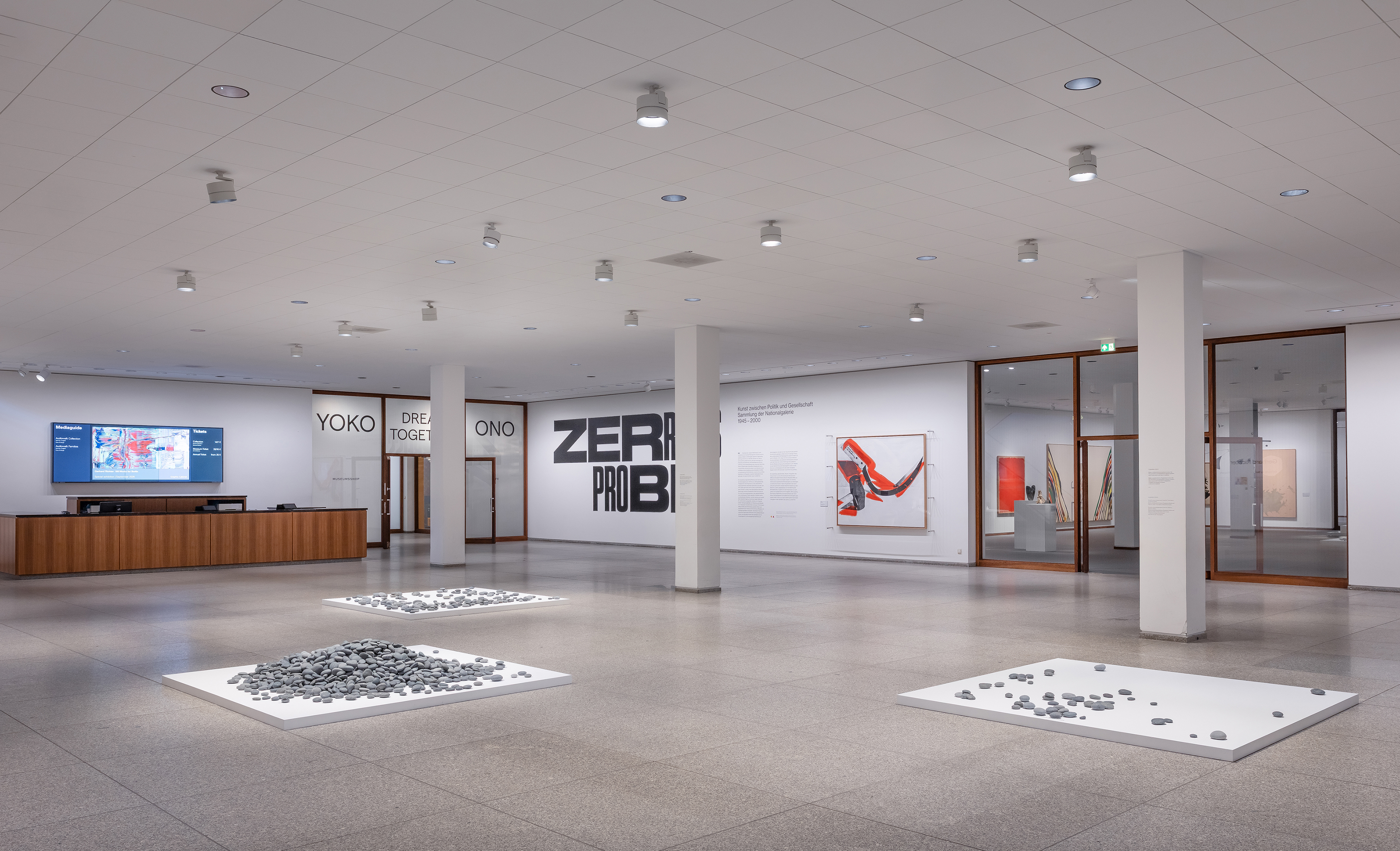 “YOKO ONO: DREAM TOGETHER at Neue Nationalgalerie is an exhibition featuring works from across Ono’s groundbreaking career. The exhibition invites viewers to move beyond passive observation and engage in active participation – both physically and mentally. Often beginning on an individual level, these actions evolve into broader collective efforts, demonstrating the transformative power of communal actions in working toward peace and imagining a different world. The works invite collective actions of repair, healing, cleaning, mending, wishing, imagining, and dreaming. Before entering the exhibition, visitors are invited to engage in a moment of self-reflection through Cleaning Piece (1996). Piles of local river stones are arranged, prompting visitors to reflect on their joys and sorrows. …”