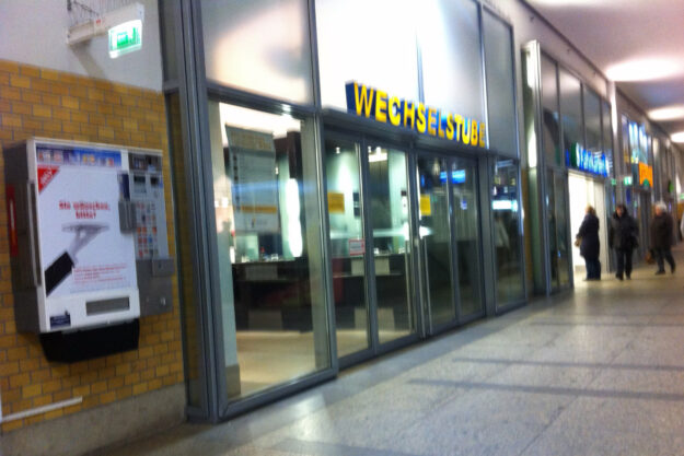 There are however some specialized money exchange booths (German: “Wechselstube”) where you can exchange your currency to Euros. The most well known are probably the one in the center of East Berlin inside Alexanderplatz Station, ground floor, see photo below) and the one in the center of West Berlin, just outside Bahnhof Zoo (Zoo Station). Exchanging money will cost you a small fee but – hey – there is only very few things in life for free – and money is not one of them.