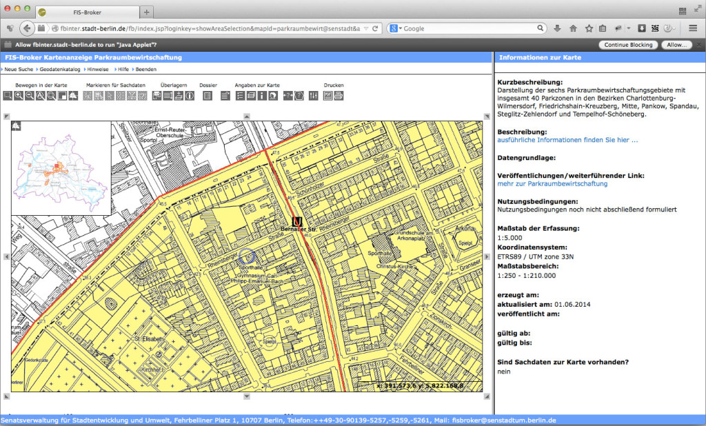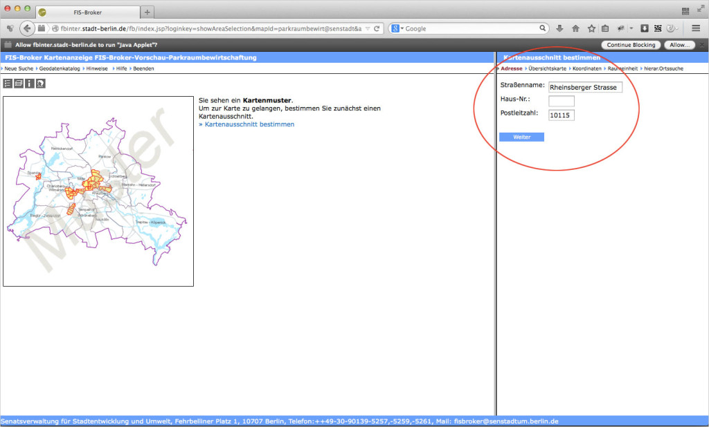 The map tool may first appear to be a bit complicated. The user interface is not really intuitive – but actually the map tool is a very complex application and you could also look for all kind of Berlin related data like unemployment rates and the like. If you just want to see where you’d have to pay, and where the free parking zones are located, all you have to do is enter an address and then navigate the map.