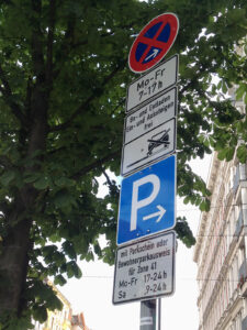 There are even street signs that indicate zones where you may stop for two minutes – the signs are called “Parkverbot” (parking forbidden) or sometimes “Ladezone” (loading zone). Often these spots are marked by a red circle, blue background, and just one red bar crossing the circle.