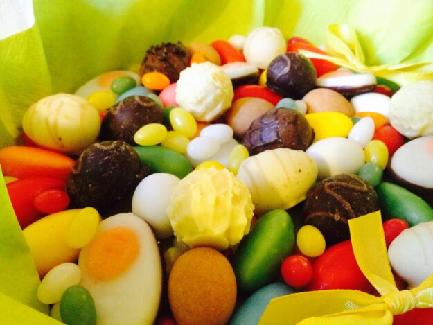 For many people it’s common to have one or more ‘Easter Nests’ around the house. The Easter Nest is often a more or less colorful decorated basket or bowl, often padded with fake or real grass you can buy from flower shops, stuffed with colorful candy, chocolate and sweets of all kinds in some Easter shape: eggs, chicken, bunny rabbits, flowers etc.