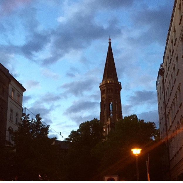 Another photo of the beautiful bell tower of Zionskirche in Berlin Mitte – and the as well beautiful evening sky. Warm Berlin summer nights can be so nice.